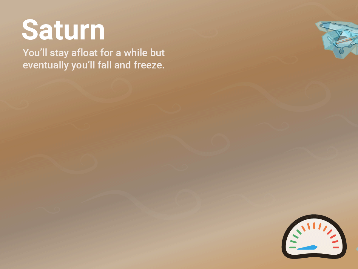 在土星上,维持飞行所需的功率和在地球上差不多。不过,在-167摄氏度的大气中,你最终将冻结并撞向星球中心,就像在木星上一样。