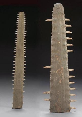 锯鳐最令人称奇的自然是扁平、延长的吻部,两侧有齿状突起,这既是它们捕猎时的工具,也是内部争斗时的武器。许多栉齿锯鳐的身上都保留着大量伤痕,显然是互相打斗的结果,其具体原因还不得而知。