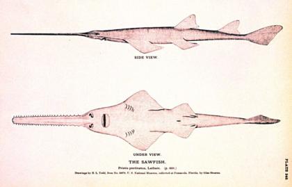 栉齿锯鳐看起来就像是长着链锯的鲨鱼,但它们其实属于鳐总目。栉齿锯鳐的体型很大,可以长到7.6米。它们在热带和亚热带大西洋曾经数量丰富,但如今已经成为极危状态。