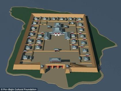 博尔巴任复原图。对于博尔巴任的用途,历史学家和科学家的观点存在严重分歧。一些专家认为这座与世隔绝的古城的建造目的是吸引岛外的人,而不是关押犯人,可能是一座夏宫、一座修道院或者一座天文观测台。