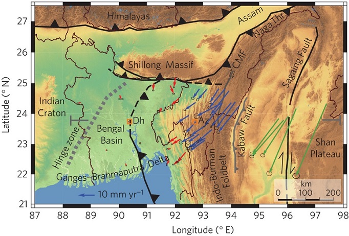 但经过再2003到2013年间使用地表及卫星GPS监控测量地表活动,一个国际研究团队显示孟加拉实际上坐落在一个巨大的俯冲带:意思是印度板块其实是在巽他板块(Sunda plate)下以每年17毫米的速率(2/3寸)推挤。