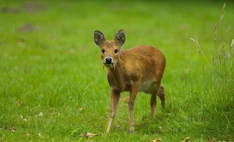 獐:这种原始的鹿物种源自中国,目前已引入至其它国家和地区,它们没有鹿角,下颚长着尖牙。