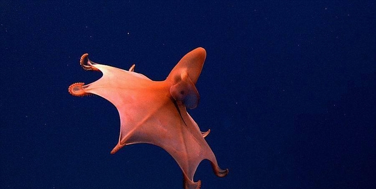 小飞象章鱼:这种罕见的深海生物有点儿神秘,研究人员知道它可以改变体色,身体能增长至1.8米。