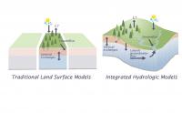 最近,科学家们就T和E如何受到各种变量(包括一个在现有水模型中未被掌握的变量)的独特影响进行了辩论:通过地表下的水向河流或其它排放水体的运动(也被称作横向地下水流动)。Reed Maxwell和Laura Condon在此利用了一个将地下水和地表水流动偶联来模拟具有和没有横向地下水流动时的水通量模型,研究涵盖了北美大陆大河流域中的大部分。