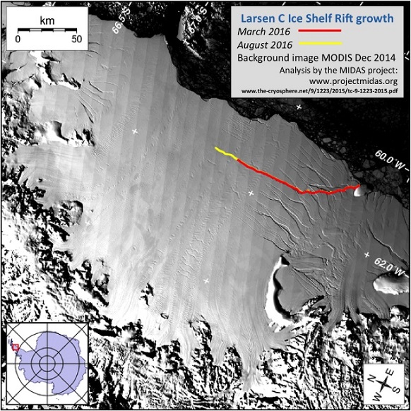 MIDAS计划团队在他们的部落格中说到:“由于裂缝不断延伸,最终会一定会导致冰棚断裂,使一大块冰山崩塌。若是以电脑模拟计算,剩下的冰棚可能会变得不稳定,而拉Larsen C可能会和之前在它附近的Larsen B在2002年时因裂缝引起解体的情形一样。”