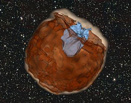 这张模拟图中,暗棕色的la超新星超新星爆炸向外抛出物质,砸向伴星(浅蓝色物体)并放射出紫外线。
