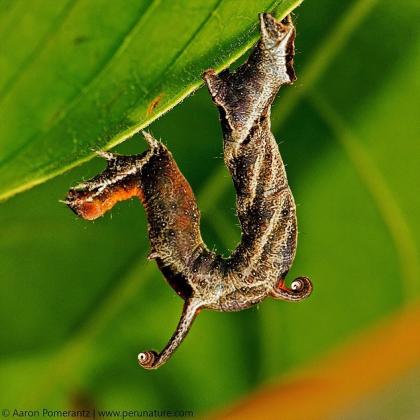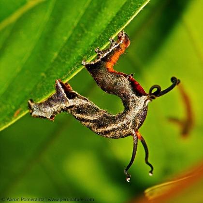 Aaron Pomerantz为生态旅游公司“雨林探险”(RainForest Expeditions)工作,他是在秘鲁东南部坦博帕塔研究中心附近的一棵树上发现这只毛毛虫的,当时他爬到了30米的高度,而毛毛虫正伪装成树枝的模样。