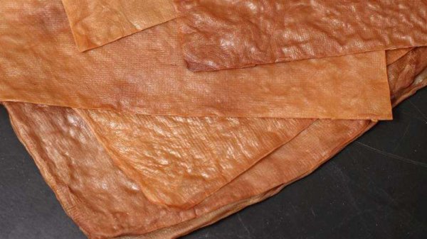 它很结实,它很厚,它是棕色的。它有点像皮革,但实际上这种诞生于实验室的新材料,是利用被冲泡过后的康普茶(一种经过发酵工序制造出来的加糖的草药茶)残留物制作而成的。