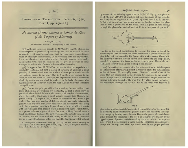 当时的学者普遍认为电有四种特性:吸力、斥力、(电)火花以及嘶嘶声,但这些特性并未出现在任何电鱼身上。甚至有些学者认为,那些鱼其实是用某种毒素攻击人类,才会导致受害者感到麻木与晕眩。(torpedo的拉丁字源就是“麻木”,此外torpedo虽然也是“鱼雷”,但那是十九世纪才发明的用法,千万不要倒因为果。)