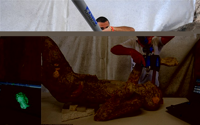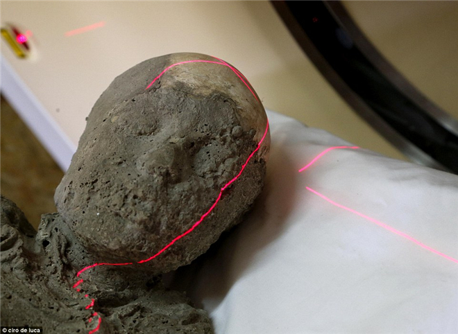 庞贝古城遗址实验室主管 Stefano Vanacore 正抱着一具儿童的遗骸,右图的红光则是正在扫描小男孩的头部。