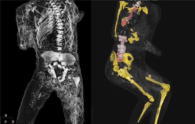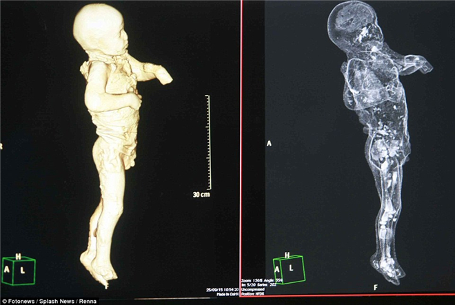 左图扫描画面就有点像医生为孕妇进行的3D断层扫描,考古学家观察出小男孩双唇紧闭,看起来相当惊恐!