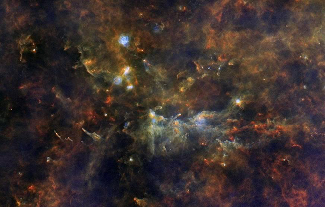 如图所示,这张伪色彩红外图像显示的是“狐狸座OB1”,该恒星群距离地球8000光年。