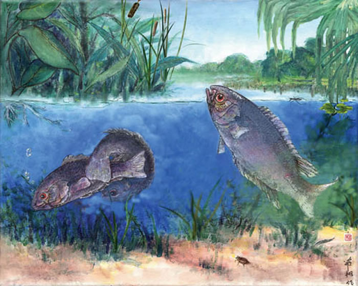 西藏始攀鲈及其生境复原图:渐新世晚期(距今约2千6百万年前)的西藏腹地曾存在温暖湿润的低地,孕育着与今天高原内部完全不同的环境和生态系统。(吴飞翔供图)