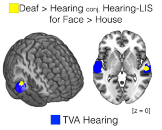 研究者请来了一群自出生时或从很小开始就听不见的聋人,以及一群听力正常的听人参与实验。就如同过去研究所发现的结果一样,他们发现不论是听人或聋人,梭状脸孔脑区在观看人脸时都比在观看房子图片时更为活跃,表示聋人和听人都会使用梭状脸孔脑区来辨识人脸。但于此同时,聋人的右大脑半球的颞叶人声脑区对脸孔的反应之大,远远超过听人的颞叶人声脑区对脸孔的反应(此处所指的听人包含会手语的听人和不会手语的听人,表示此结果并非会/不会使用手语所造成)。而且,右侧颞叶人声脑区对人脸愈敏感的聋人,辨识脸孔的能力愈好,但这个现象并未出现在听人身上。