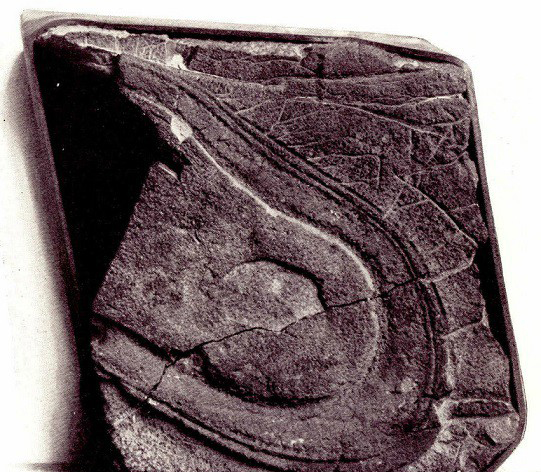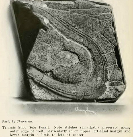 “当我在下山时,我的目光被一块在一堆松散岩石上的化石所吸引。我把它捡起来放入口袋,做更进一步的观察,最后得知这块化石源自一只从脚后跟吸出来的鞋底,而且处于可塑状态。我还发现它是三叠纪时代的石灰岩,而且还贯穿整座丘陵带。”