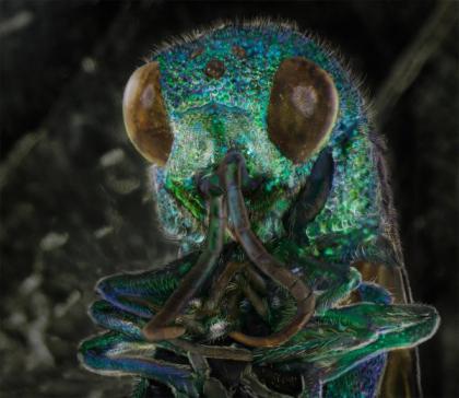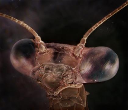 他通过立体显微镜捕捉昆虫的颜色,用微型LED照射样本,然后使用两三个小反射镜和柔光镜微调成像。显微镜是浅景深,所以他可以利用不同的焦距结合六幅图完成最后的图像。