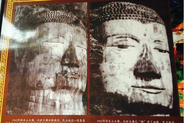 1963年的时候,灾情不见好转,饿死的人继续增加,大佛无力拯救苍生,再一次的闭眼默默流泪。 1976年的乐山大佛闭眼事件,唐山大地震死伤数十万,大佛怨天不公,面露怒色。