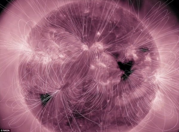 2016年3月12日,NASA的太阳动力学天文台拍摄了一张照片,研究人员据此描绘出太阳的磁场。科学家可以通过这些复杂的线条,了解太阳磁场随表面及内部不断运动而产生变化的方式。从图中可以看出,太阳表面的亮斑附近的磁场线最为密集——这些亮斑是磁场十分活跃的区域,另外还有许多磁场线连接着不同的活跃区域。