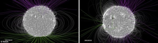 左图为2011年1月(太阳极小期过后3年)的太阳磁场,右图为2014年7月(太阳极大期)的太阳磁场。