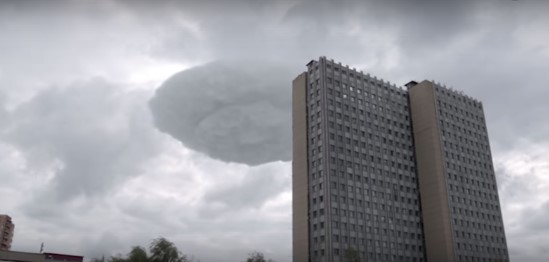 从这段影片中可以看到,飞碟状的云朵在一栋建筑物的上空缓缓移动,而且仍维持飞碟的形状,仿佛就像以云雾进行伪装的飞碟在低空盘旋。