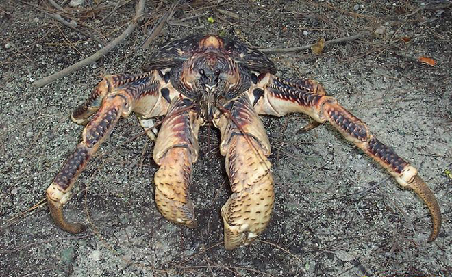 椰子蟹:椰子蟹生活在印度洋和太平洋周围的岛屿上,它的体型能够达到91厘米。令人吃惊的不仅仅是它们的庞大体型,它们也能够攀爬树木来寻找食物。