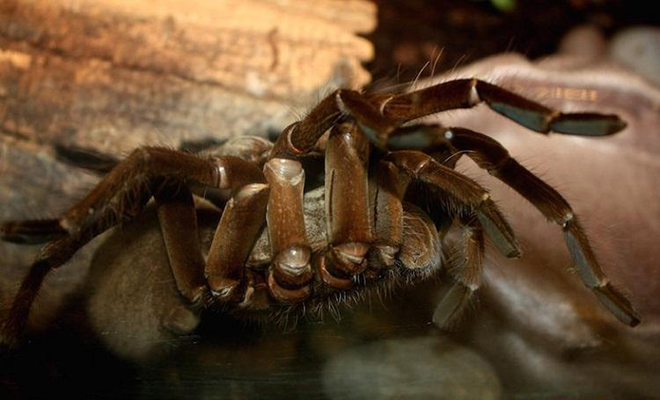 歌利亚食鸟蛛:这种宽达28厘米的食鸟蛛属于蛛形纲动物,它们生活在南美洲雨林中,有着带毒液的尖牙和刺人的体毛。