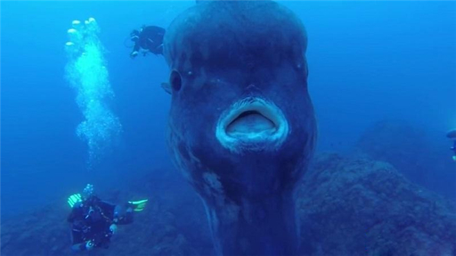 这是一条翻车鱼,它很明显让周围所有的潜水者都变的那么渺小。然而这条翻车鱼很明显不会伤害他们,他们聚集在一起开始拍摄这一海底奇观。