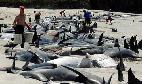 2002年夏天,66只领航鲸在美国麻萨诸塞州的鳕雪角集体自杀。某天下午,在海滩享受盛夏的人类,发现一群领航鲸往岸边游来,掀起层层波浪。游客尽情逗领航鲸玩,但它们却异常冷漠,使力游向沙滩最浅的地方﹐甚至有几只领航鲸奋力一跃﹐躺到了热辣的沙滩上,慢慢阖上眼睛,不听身旁游客的关切。