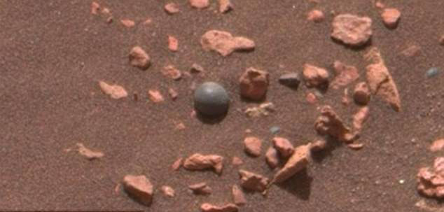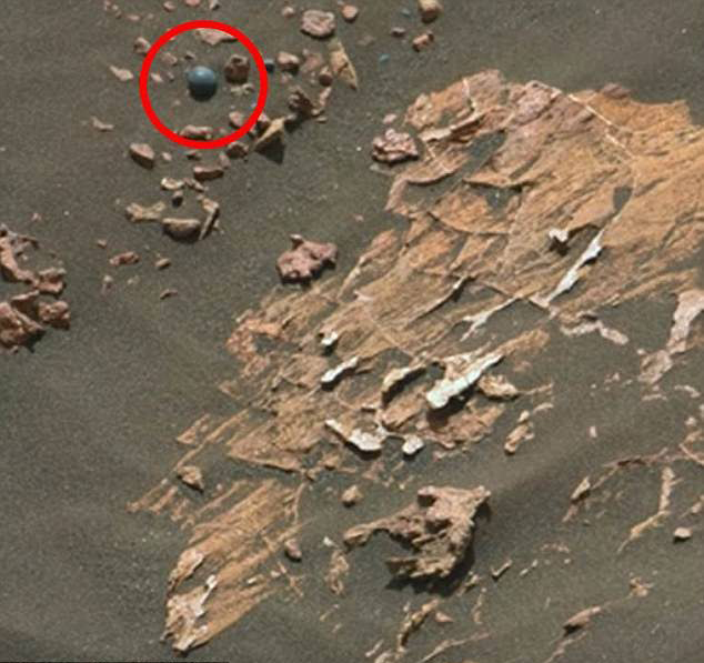 影片中能看到,把颜色增强之后,火星上的这棵灰色的岩石就像一一颗球,有位站长(幽浮观测网站)Scott C. Waring评论说:“这大小和炮弹一样。”他说这是火星上曾经发生过战争的证明,这“球”周围的碎片应该是一个文明聚集地。