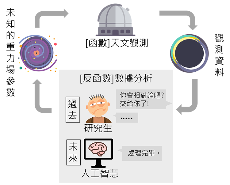 图二、重力透镜观测资料和未知重力场参数的关系。光线从宇宙深处到达地球,我们不确定光线经过什么样的重力场,但根据观测到的结果我们可以反推。反推重力场是一个复杂费时的工作。人工智能能简化这个反推的理论,达到一个令人满意的近似结果。但这并不代表未来不需要研究生,而是研究生可以从事更有创造力的研究工作。