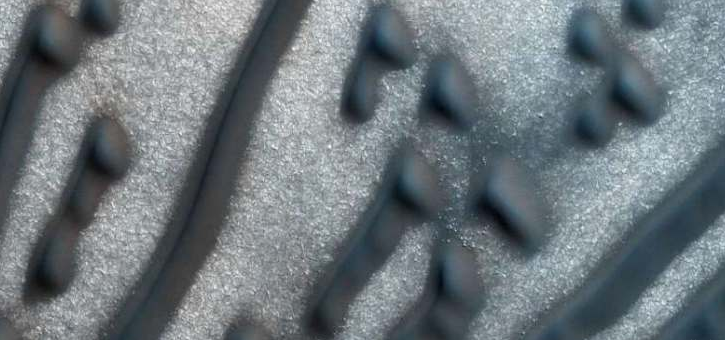 ▼火星探测轨道飞行器(MRO)搭载的HiRISE高分率相机拍下的沙丘模样,看起来就像是地球上所使用的“摩斯密码”。