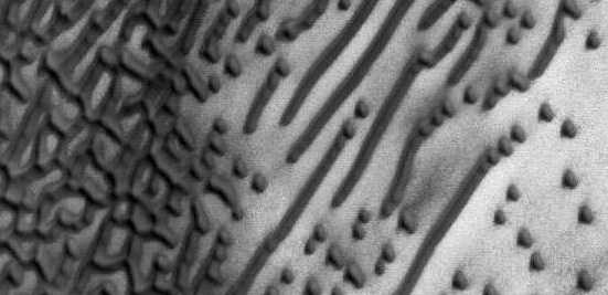 ▼根据NASA表示,这一处被拍摄的地点是一个圆形凹地(可能是一个古老但已被填平的撞击坑),因为凹地的地势,影响了风向的吹袭,所以导致了凹地内的沙丘形成了奇特的点状或是长条状。但是在火星其他地方尚未发现类似的沙丘。