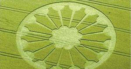 “麦田圈是英国人于1983年发现的:麦田圈周围没有任何足迹,圈内麦秆因弯曲而倒下,并未折断,可以断定不是用脚压出的。圈内植物的生长方向有不寻常的变化。