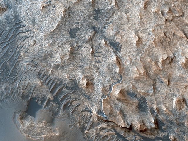 在这张图片中,有一些罕见的块状沉积物分布在淡棕色的峡谷谷底,其颜色比较深一点,每块的直径介于100至500米之间。尽管大多数都是圆形的,但有些有棱角或比较瘦长。