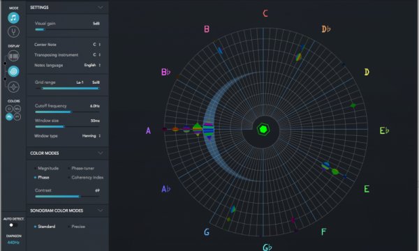 根据这个原则,科学家发展出一个新算法,它用来分析所有光谱声原件然后用图像表现出来。第一次使用“蜗牛”模式时,光谱容量的活跃区由高光点或者螺旋结构表示:一循环相当于一个八度:低音接近螺旋线的中心而高音远离中心。“民谣调音”的频率(默认值为440赫兹)在螺旋线上是由一个稠点标记的。每一个被分析的频率的振幅都转化成响度(一种描述被人体接受的音量大小的数值),它自身又被转化成亮度水平:如果声原件的音量是原来的两倍高,那么高光点就比原来亮两倍。评价噪声和伴随解调相位的同步化的质量时,需要观察高光点的大小变化。用户可以通过目标作业功能调节光斑定位的精确度(音调,音乐可视化等等)。其他的信息可以根据选择的模式(音量,解调相位,等等)由色彩表示。你还可以使用两种附加的模式。“声谱图”模式在键盘上显示有时间轴的活跃声区。“调谐器”模式显示目标精选音符声原件的猛增状态。除此之外,这个目标音符的每一个单元都由解调相位给出的一个角来代表:循环性使它可以很好地估计调音质量(两秒一循环意味着音频在0.5赫兹处有缺失)。