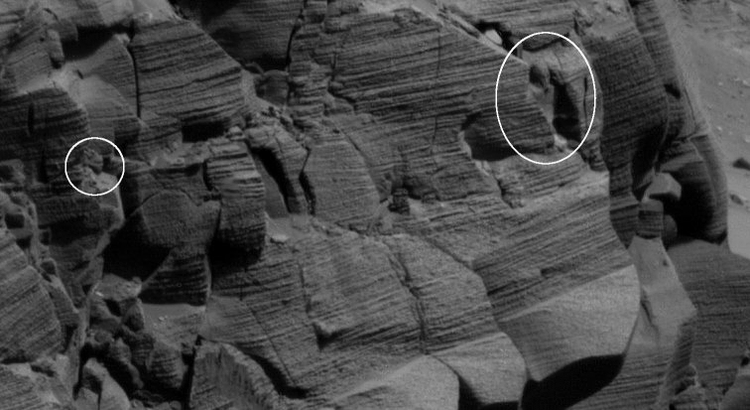 这张非常怪异的火星照片被很多人解读为古代雕像遗迹,它极像古苏美文明和阿努纳奇传说中的描述,这些创世神来到地球寻找黄金。NASA拍的原始照片在这里。(Martine Grainey提升照片解析度)