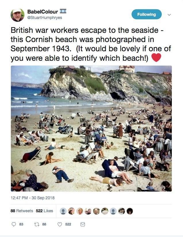 英国一位艺术家日前上传一张拍摄于1943年的照片,起初,艺术家只是想带大家回顾“战时工人逃到海边、短暂休憩”的模样,拍摄地点位于英国康沃尔海滩。