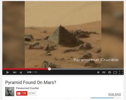 外星人爱好网站《ParanormalCrucible》指出,他们在5月7日的画面中发现疑似为金字塔的物体,其形状及设计都完美地如同人工所打造,怀疑为火星古文明,但也有许多人看过影像后,认为只是天然风化所形成的风景。