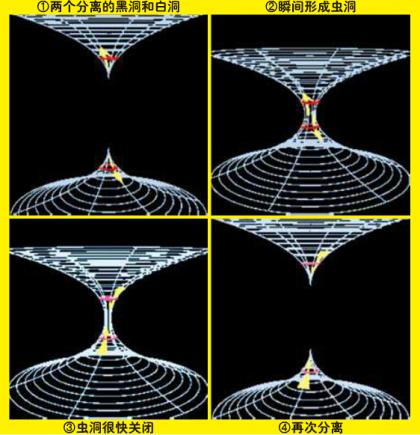 下页图中表示了史瓦西虫洞的隧道的变化过程。形成前只是两个分离的黑洞和白洞,形成虫洞后瞬间又变成黑洞和白洞。在图中可以看出,任何尝试穿过虫洞的东西都不可能从另一端出来,它最终都会在虫洞关闭之后撞到奇点上。