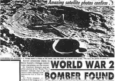 1987年3月苏联人造卫星从月球背面发回的传真照片显示,有一架“二战”时期的美制老式轰炸机,停放在月球的陨石坑边, 机身机翼都有明显的美国空军标志,有人推测可能是外星人掳到月球上去的。 苏美两国科学家曾打算成立一个特别小组进行秘密调查,可是苏联卫星于1988年7月再次扫瞄该地时,飞机已神秘消失,暗中监控的美国专家承认该架飞机是7月22日从月面失踪的。