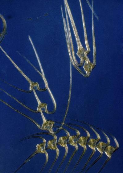 鞭毛藻:鞭毛藻是最大的海洋微生物,体长0.17厘米,长着独特的外壳,以及类似角状的结构。图中的鞭毛藻是放大200倍的效果。加拿大麦吉尔大学微生物学家杰伊-纳多(Jay Nadeau)说:“角状结构可存储蓝藻细菌,当营养物质较低时,为鞭毛藻提供氮。”