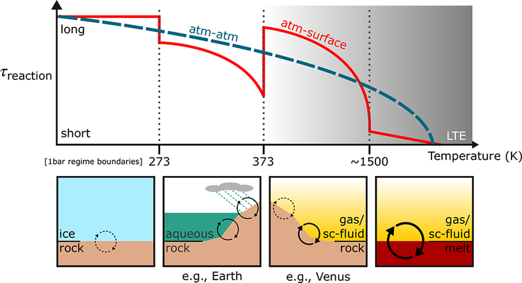 不同岩石行星气候地球动力学状态下的表面─大气相互作用(红线)和大气平衡(蓝色虚线)的时间范围。显示不同类型的类地世界如何影响大气层。(Source:arxiv.org)