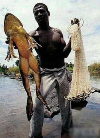 非洲男子捕获世界上最大的青蛙,重达三公斤,长度达33厘米。