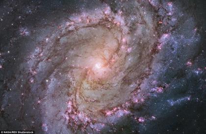 这是螺旋星系M83,图中洋红色和蓝色部分是恒星形成区域。