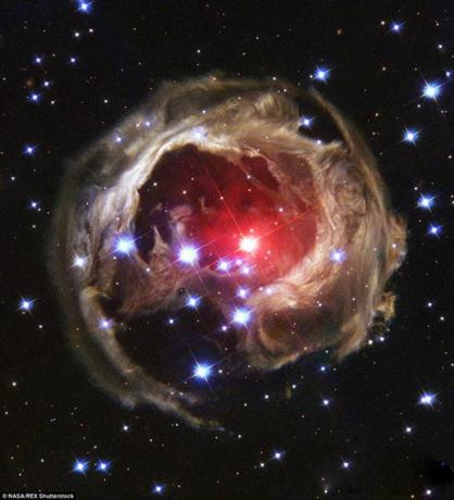 这张照片是2004年2月8日哈勃望远镜先进巡天相机(ACS)拍摄的,显示一颗遥远星恒星周围的扩张光晕。