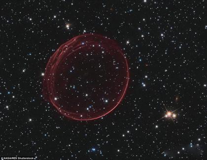 这是从SNR 0509-67.5超新星释放膨胀冲击波的原始气体泡,它是距离地球16万光年之遥的大麦哲伦星云中一颗强大恒星爆炸的残留物。