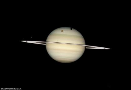 2009年2月24日,哈勃望远镜拍摄到土星4颗卫星运行至该行星前方。