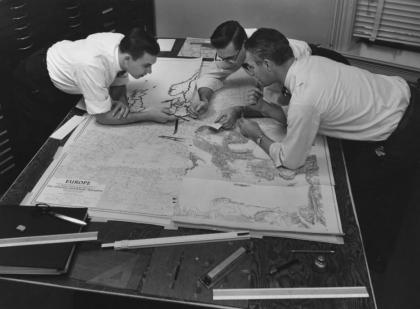 1957年,制图部门透过一种小型手持卫星追踪器,为太空计划贡献了创意。这个装置的发明者是威曼.钱柏林(1964至1971年任首席制图师),他也发明了“地理尺”,这种透明的塑胶薄片可以覆盖在地球仪上测量距离。