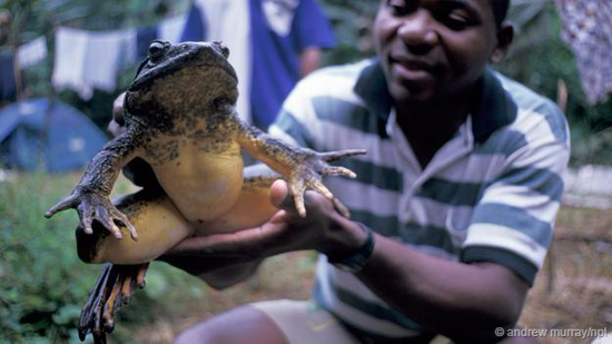 尽管行踪隐蔽,但非洲巨蛙还是没有避免濒危的命运。根据报告,过去三个世代中,非洲巨蛙的数量已经下降了50%。这种青蛙被捕杀作为食物,或者供应宠物市场,特别是美国举办的蛙跳比赛。