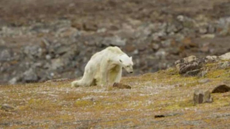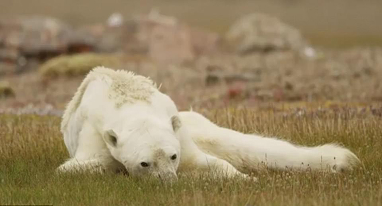 因为全球暖化,北极的冰一直慢慢融化,北极熊被逼着往南走,没有办法像以前一样去猎食栖息在冰上的海豹。拍摄这些照片跟影片的摄影师Paul Nicklen(生物学家),他曾见过超过3000只熊,但这只北极熊让他印象最深。难过的是,因为加拿大法律禁止人类喂食北极熊,而且即使Paul真的偷偷喂了,这也只是稍微延长一点时间而已,最后这只熊应该还是会饿死。